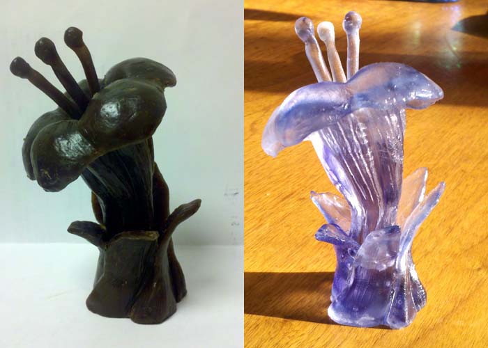 Hand made wax model on the left, the resulting lost wax process glass casting on the right