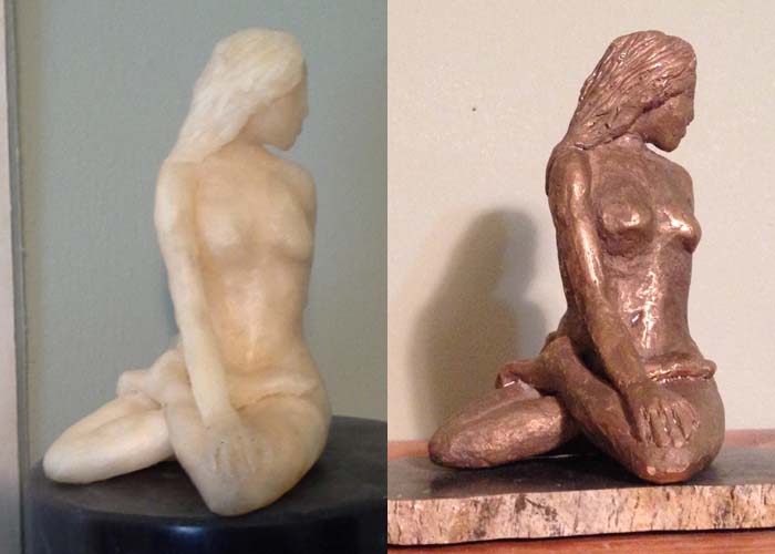 Hand made wax model on the left, the resulting lost wax process bronze casting on the right. 6 inch high.