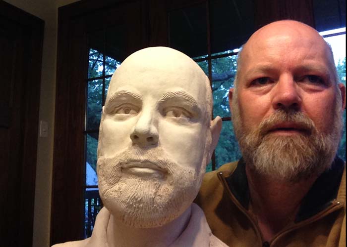 Self Portrait. Fired earthenware clay. This piece was modeled by eye using mirrors and an old pair of my eye glasses to check size.