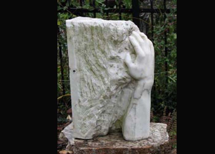 Hang On. This was a study of carving a hand. The stone is a salvaged block of Vermont marble from a demolished building.